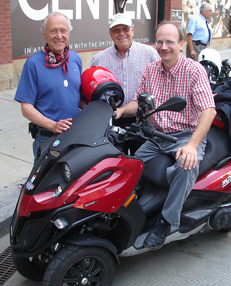 Noontime Tuesday saw cross-country motorcyclists Buddy and Bob pull into Pittsburgh, fresh from a drive across Ohio the previous day. Actually, they stopped at my workplace, the Senator John Heinz History Center. Greeting them too were PBS Producer Rick Sebak (below, middle) and cameraman Bob Lubomski, filming a program about the Lincoln Highway. (Click here to see it larger on Flickr – once there, click All Sizes above the photo.)