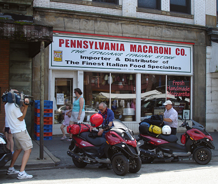 The History Center is at the eastern edge of Pittsburgh’s downtown and at the western edge of the Strip District, named becasue it’s a thin strip of land along the river. It’s been home to mills and rails and workers and churches but in recent decades it’s known for prduce stands, and more recently, restaurants and nightclubs. Here’s Bob L getting a shot at Penn Mac, a great place to buy cheese, olives, and other Italian specialties.