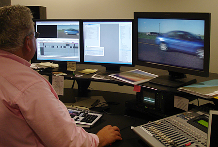Above, Rick reviews the opening sequence and is about to cut the scene with the blue car — too similar to other road shots. Computers let him drag and drop segments of video like magnets on a refrigerator, then editor Kevin Conrad will perform the final splices (all digital of course). We also visited Paula Zetter, who designed the postcards.