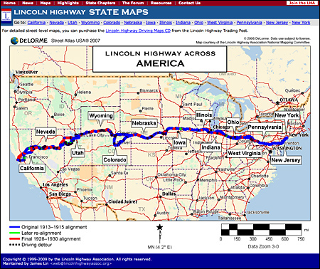 Paul Gilger, head of the mapping committee for the Lincoln Highway Association, has uploaded a national and statewide maps of the Lincoln Highway to the LHA site. Though they only show basic routings, the maps should be a huge benefit to fans thinking of following the first coast-to-coast highway.