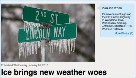 We can dream of summer road trips this time of year but for now it’s only one month into Winter. Here’s a nice photo (if you like cold weather) from the Omaha World-Herald showing a Lincoln Way street sign in Woodbine, Iowa, known for it’s brick-paved stretch of Lincoln Highway.