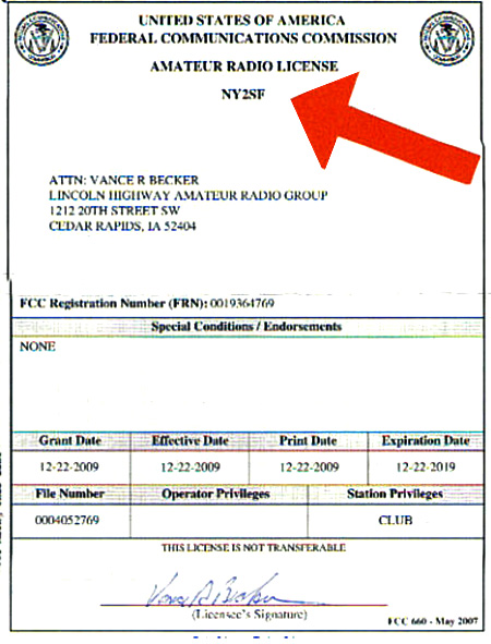 The Iowa amateur radio operators who for the last two years have operated a summer “special event” radio station celebrating 95 and then 96 years along the Lincoln Highway have banded together under the name Lincoln Highway Amateur Radio Group (LH-ARG). They applied to the Federal Communications Commission for a special call sign to use during on-the-air club operations and they now hold the unique call sign: NY2SF — that is, ”New York to San Francisco, from the eastern terminus to the western terminus of the Lincoln Highway.