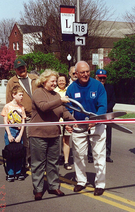 Mike sent this photo from the dedication of the Ohio’s Lincoln Highway Historic Byway in April 2004: “The ribbon-cutting was in Van Wert, appropriately, because Larry and Kriss Salters (also with scissors) were the two people who did the most to make that happen, processing a lot of paperwork with ODOT to make the thing a reality.”