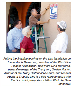 The Tracy Press reports that more reproduction LHA “Control Station” signs are being posted along the original Lincoln Highway route in western California: “A sign tacked on the front of the Tracy Inn provides another identification of 11th Street as a route of the historic Lincoln Highway, the first highway network to span the nation in 1915. The new sign identifies the Inn as a ‘Control Station,’ where motorists using mileage listed on the Lincoln Highway map can exactly gauge their location. Similar signs are being posted in Stockton, French Camp, and Livermore.”