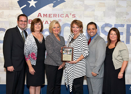 Accepting the award, above from left: Justin Hardee, Heritage Corridor CVB; Melissa Hendricks-Kribs, Illinois Department of Transportation; Cindi Fleischli, Illinois Office of Tourism; Bonnie Heimbach, Northern Illinois Tourism; Bob Navarro, Heritage Corridor CVB; and Sue Hronik, Illinois Lincoln Highway Coalition.