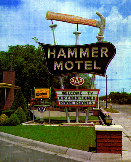 Fred Hammer wrote to say hello after reading my post on the history of his family’s motel along the Lincoln Highway in Kearney, Nebraska: “I grew up in that motel — watched it grow from 8 rooms to 35. My dad was one of the founders of the Best Western chain and took pride in that organization…. In the landscaping I donated to the university, I had three brick columns placed in the southwest corner, similar in shape to what was at the motel — and, in one of the columns, there is embedded a plaque which has a miniature imprint of the motel sign” So next time you’re in Kearney, take the time to find the honorary landscaping and plaque on Watson Blvd. at 19th Street.